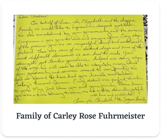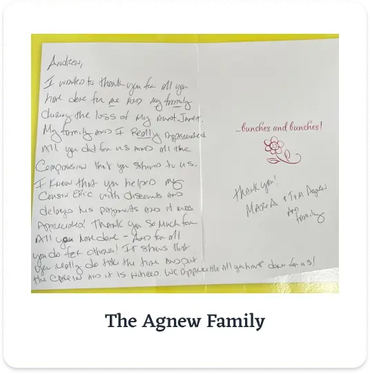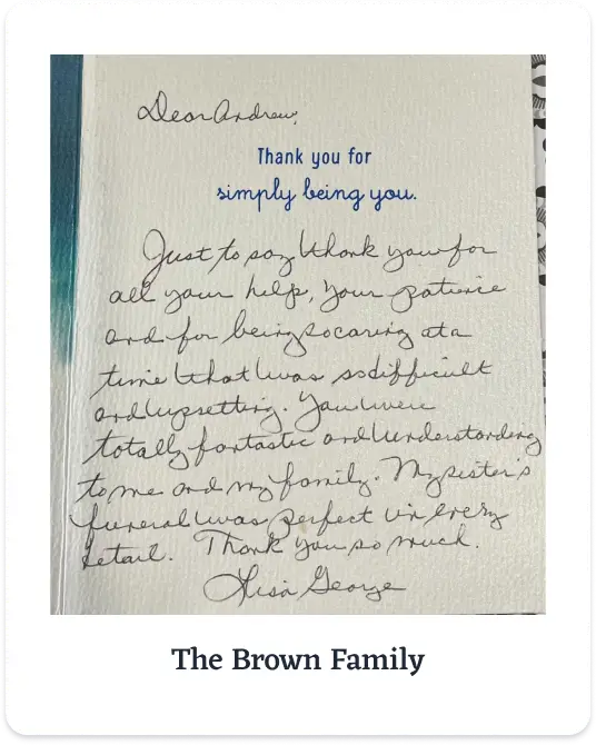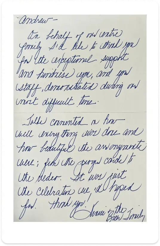 We continue to care for our families after the service is done by offering bereavement and support groups, hosted at our locations.
